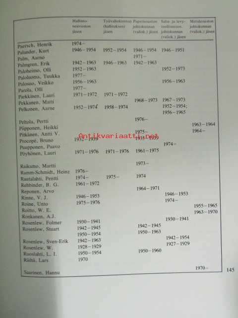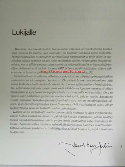 | Saatavilla | 1 kpl | | Julkaisuvuosi | 1977 | | Sivuja | 154 | | Painos | 1 | | Kunto | K3 | | Kansipaperissa pieni sentin repeämä etupuolella | | Sidonta/painoasu | Sidottu (kansipaperit) | | ISBN | 951-99105-8-1 | | Kielet | Suomi |