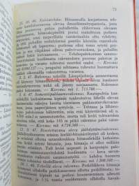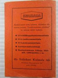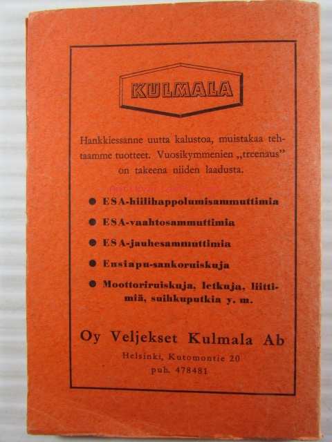 | Saatavilla | 1 kpl | | Julkaisuvuosi | 1953 | | Sivuja | 114 | | Painos | 2. | | Kunto | K2 | | Sidonta/painoasu | Nidottu (pehmeäk.) | | Kielet | Suomi |