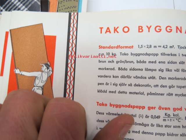 Denna byggnad isoleras och inredes med TAKO-byggnadsmaterial Takolit, Tako byggnadspapp, Tako tapet, Tako spänpapp, Tako spännpapper, Tako färgade spänpapper, Tako takwellpapp, Tako färgade takwellpapp, användning av Takolt -esite ja ohjekirja TAKO-eristys ja pinnoitusmateriaaleista