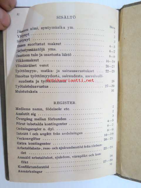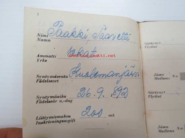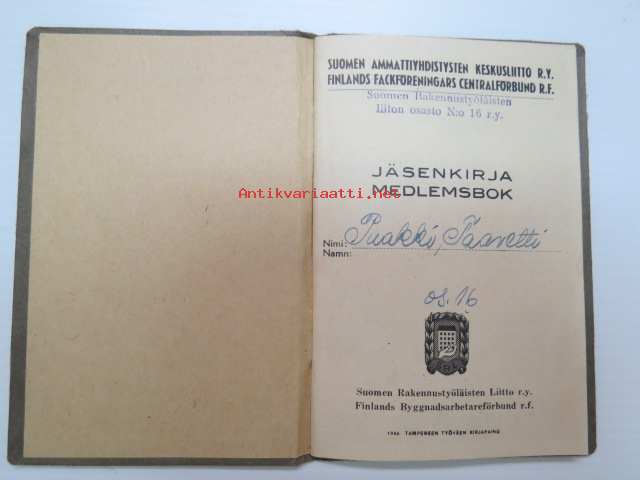 Suomen Ammattiyhdistysten Keskusliitto SAK / Suomen Rakennustyöläisten Liitto ry jäsenkirja 1950 Taavetti Paakki, syntynyt 1892 Kuolemajärvi