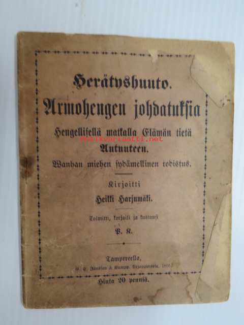 Herätyshuuto. Armohengen johdatuksia hengellisellä matkalla Elämän tietä Autuuteen. Wanhan miehen sydämellinen todistus kirjoitti Heikki Harjumäki. Tampereella 1895