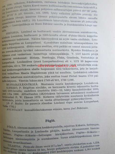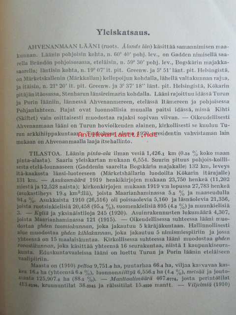 Suomenmaa Ahvenanmaan lääni II Maantieteellistaloudellinen ja historiallinen tietokirja, Lisäksi aakkosellinen hakemisto ja kartta, katso kuvista sisältö tarkemmin.