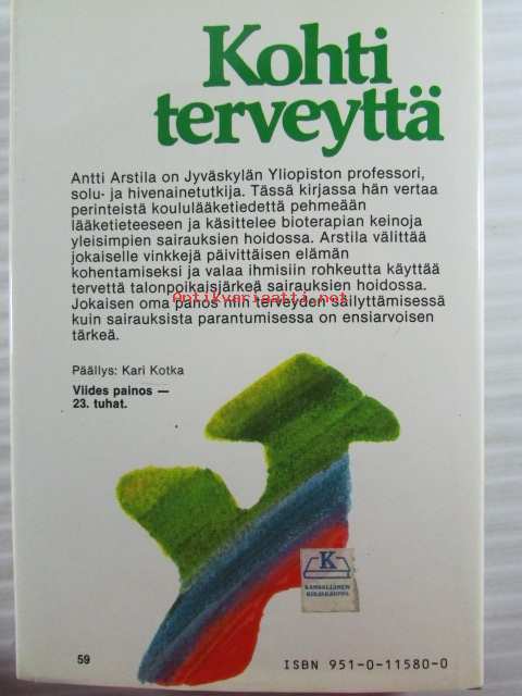 | Saatavilla | 1 kpl | | Julkaisuvuosi | 1983 | | Sivuja | 165 | | Painos | 5. | | Kunto | K3 | | Sidonta/painoasu | Sidottu (kansipaperit) | | ISBN | 951-0-11580-0 | | Kielet | Suomi |