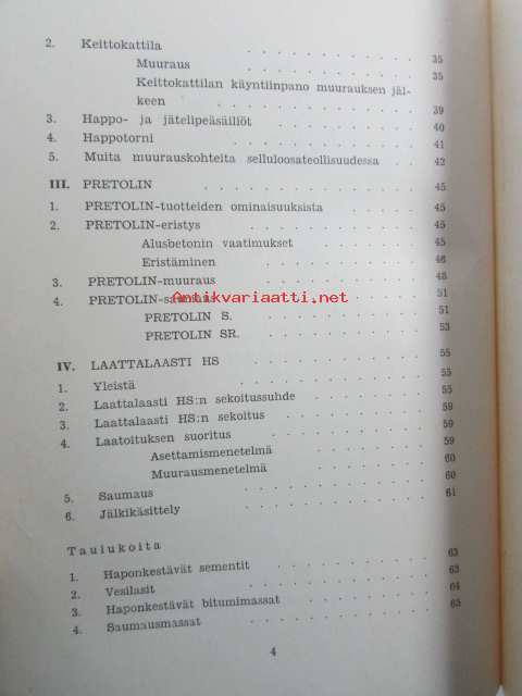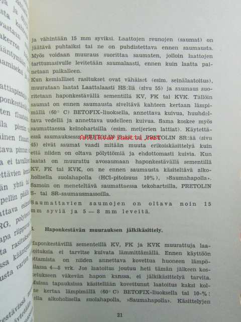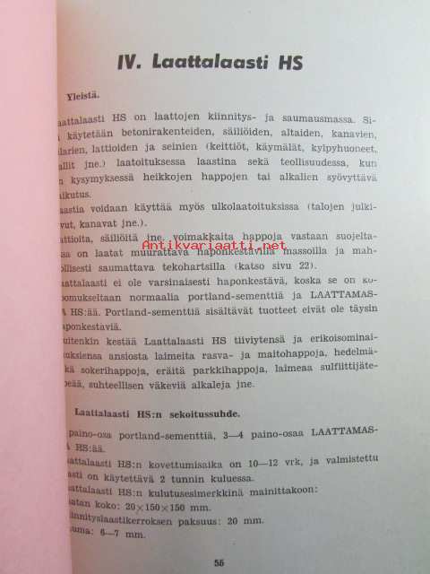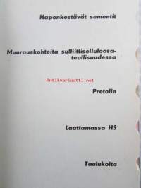 Erikoislaasteja ja -massoja - Haponkestävät sementit, Pretollin massat, Laattalaasti HS, taulukoita.