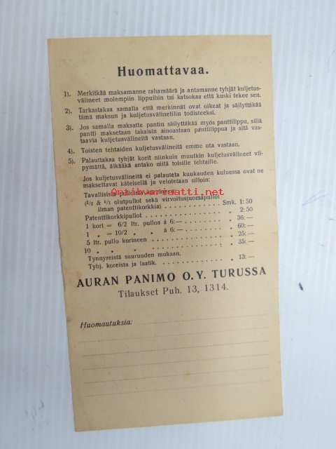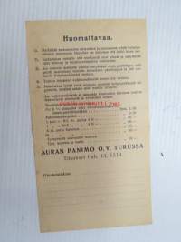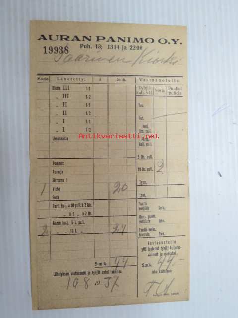Auran Panimo - Saarinen Kioski Vistanmäki -lähetyskuitti 10.8.1937
