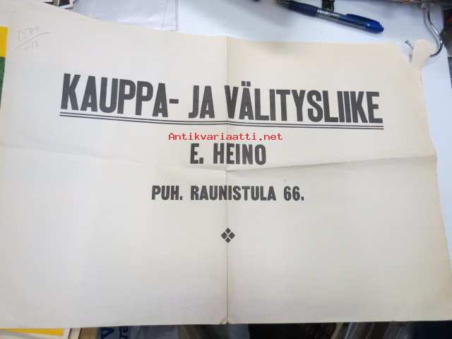 Kauppa- ja välitysliike E. Heino Raunistula (Turku) puh. 66 -mainosjuliste