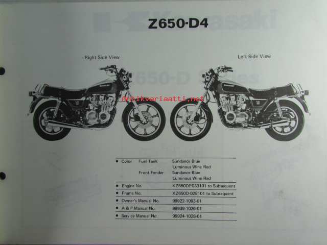 Kawasaki Z650-D for European market, motorcycle Parts Catalog -varaosaluettelo