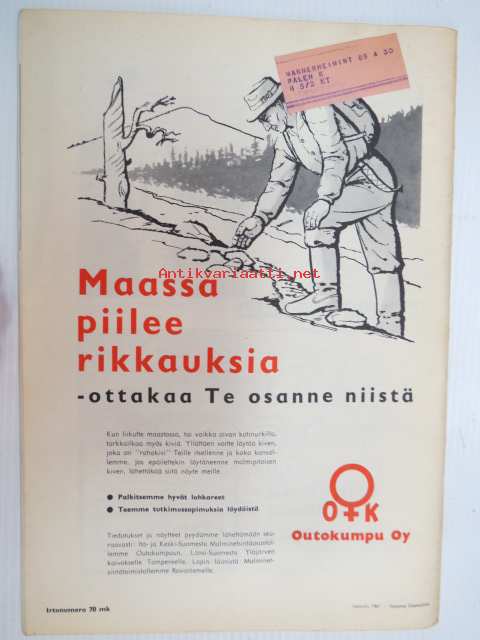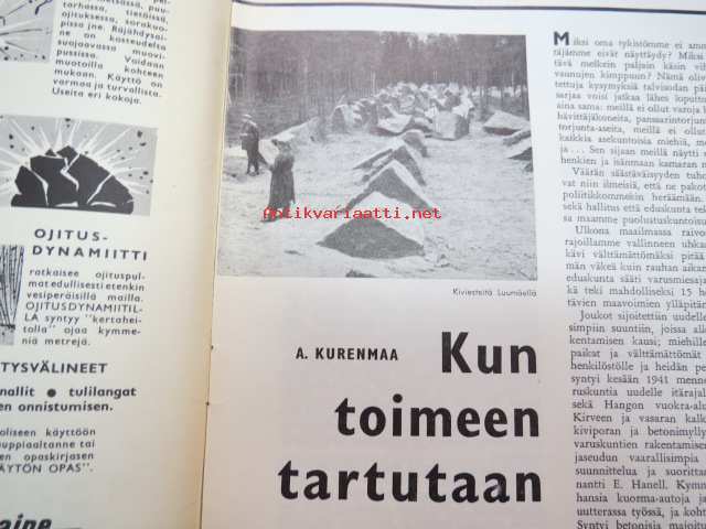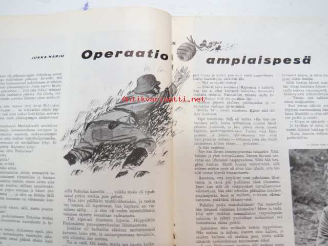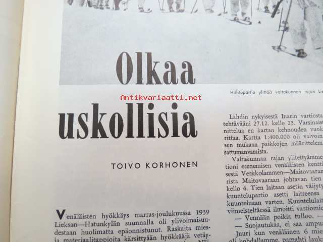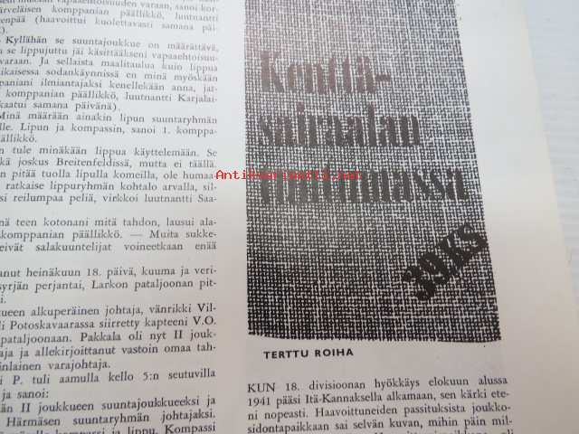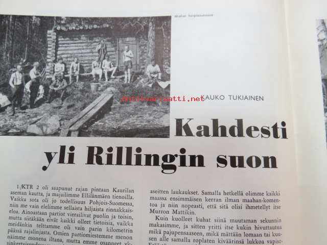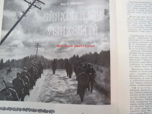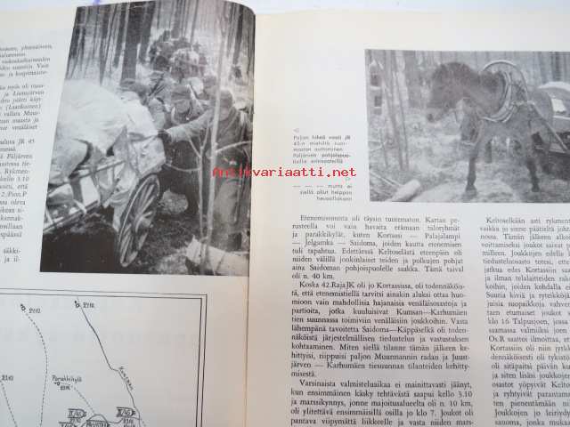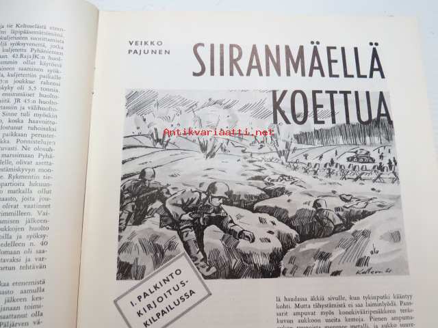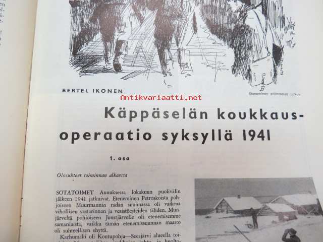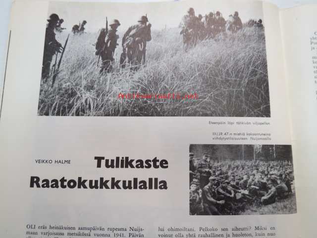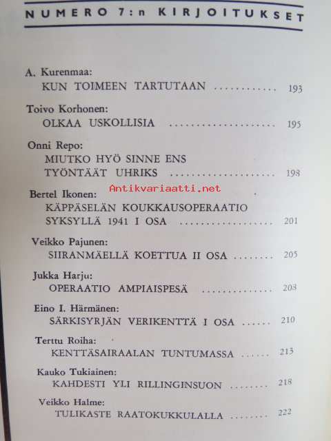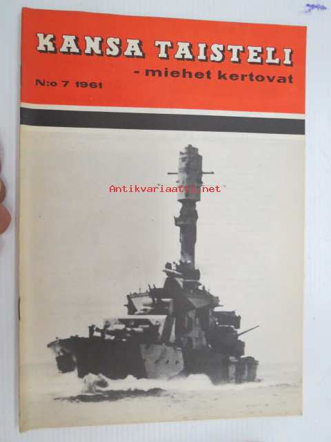 Kansa Taisteli 1961 nr 7 sis. seur. artikkelit; A. Kurenmaa - Kun toimeen tartutaan, Toivo Korhonen - Olkaa uskollisia, Onni Repo - Miutko hyö sinne ens työntäät uhriks, Bertel Ikonen - Käppäselän koukkausoperaatio syksyllä 1941 osa I, Veikko Pajunen - Siiranmäellä koettua osa II, Jukka Harju - Operaatio Ampiaispesä, Eino Härmänen - Särkisyrjän verikenttä osa I, Terttu Roiha - Kenttäsairaalan tuntumassa, Kauko Tukiainen - Kahdesti yli Rillinginsuon - Veikko Halme - Tulikaste Raatokukkulalla21 x 30 cm.
