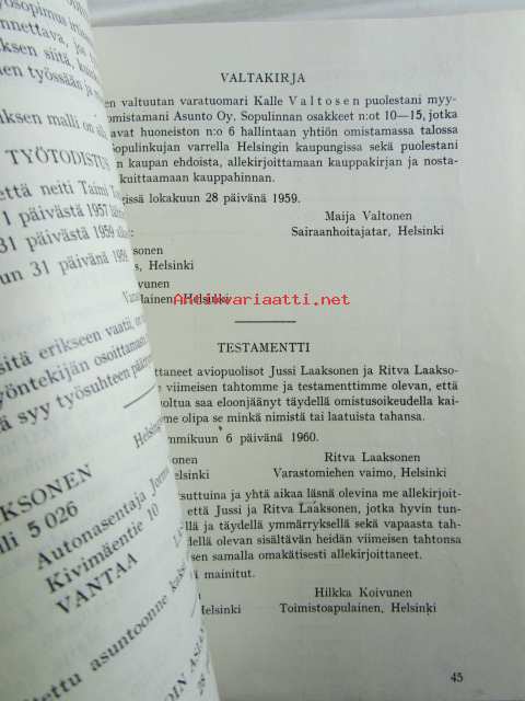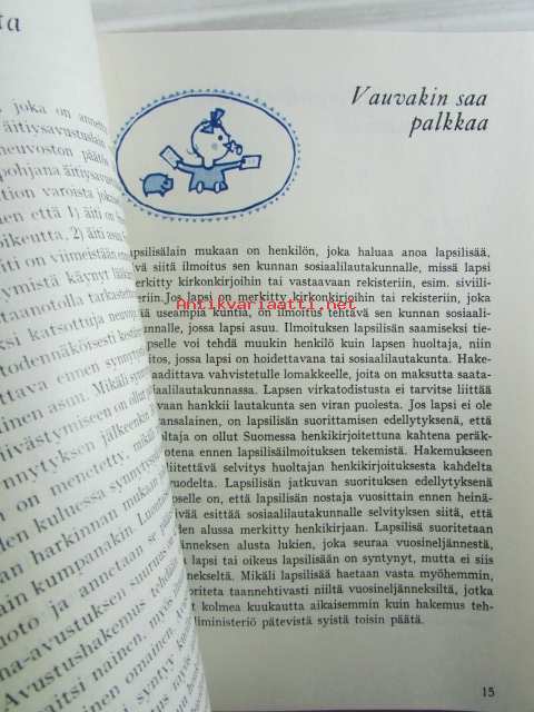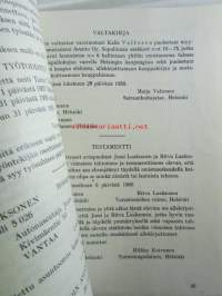 | Saatavilla | 1 kpl | | Julkaisuvuosi | 1960 | | Sivuja | 47 | | Kunto | K2 | | Sidonta/painoasu | Nidottu (pehmeäk.) | | Kielet | Suomi |