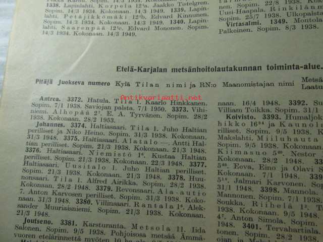 Metsänkäyttöoikeuden rajoitukset yksityistiloilla 1. 1. - 30.6. 1938 Inskränkningarna i rätten atta förfoga över skog å enskilda lägenheter 1.1.1938 - 30.6.1938. mm. Etelä-Karjalan ja Itä-Karjalan alueet mm. Antrea, Johannes, Kivennapa, Kuolemanjärvi, Jaakkima, Suistamo, Viipuri
