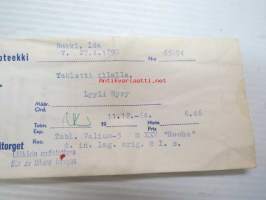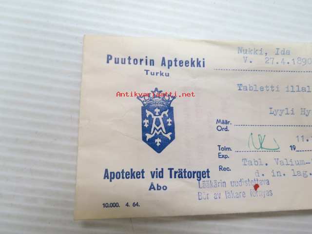 Puutorin Apteekki, Turku, 11.12.1964 Apoteket vid Trätorget -apteekkisignatuuri / lääkepussi