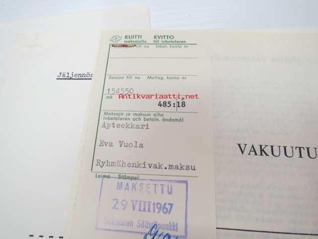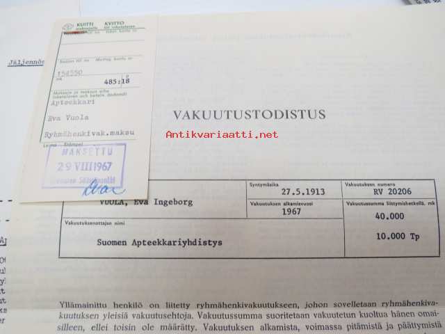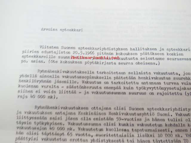 Suomen Apteekkariyhdistys / Siikaisten Apteekki - Eva Vuola -ryhmähenkivakuutus / Apteekkariliiton kiertokirje
