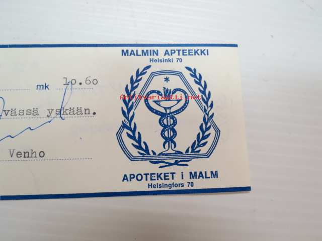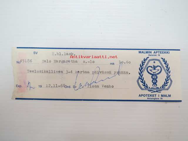 Malmin Apteekki - Apoteket i Malm, Helsinki, 12.11.1968 -apteekkisignatuuri, reseptiliuska