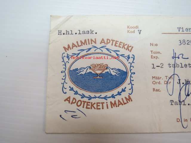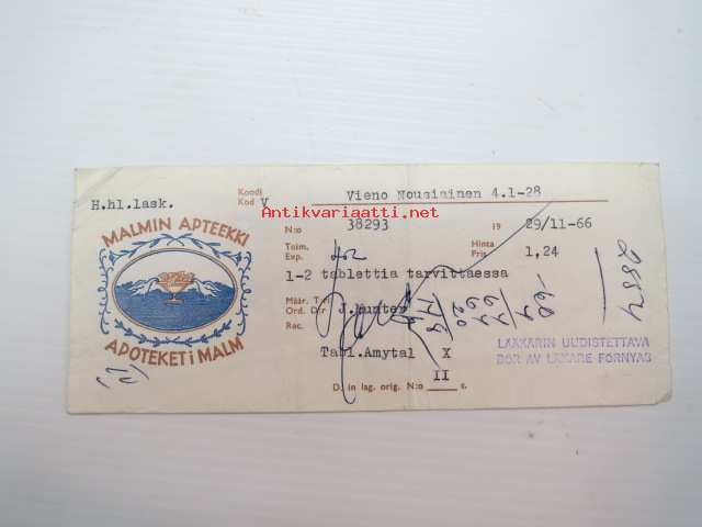 Malmin Apteekki - Apoteket i Malm, Helsinki, 29.11.1966 -apteekkisignatuuri, reseptiliuska