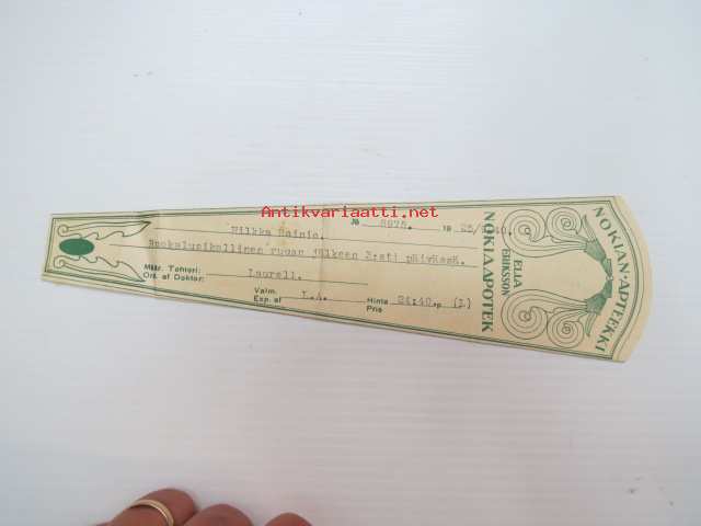 Nokian Apteekki - Nokia Apotek, 25.9.1940 -apteekkisignatuuri, reseptiliuska
