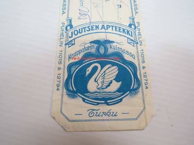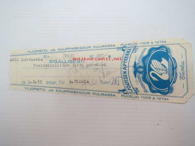 Joutsen Apteekki, Turku, 3.2.1959 -apteekkisignatuuri, reseptiliuska