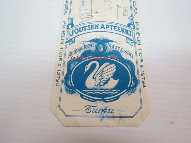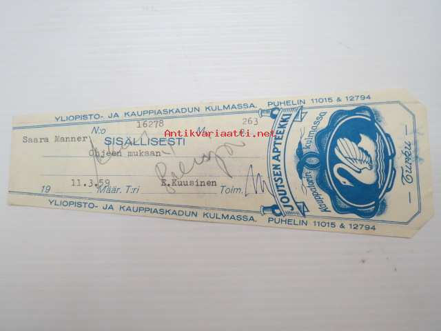 Joutsen Apteekki, Turku, 11.3.1959 -apteekkisignatuuri, reseptiliuska