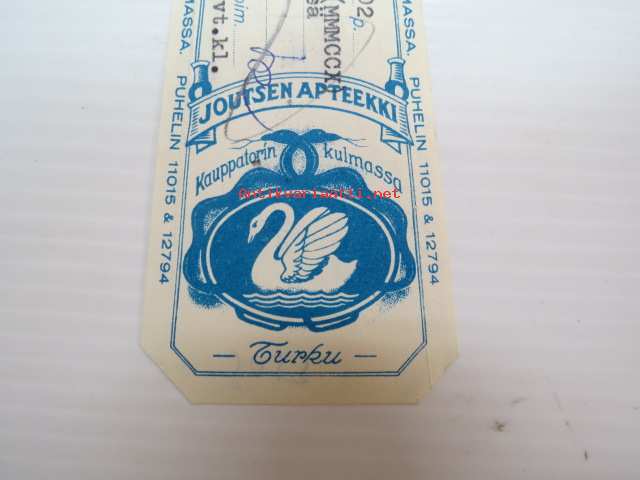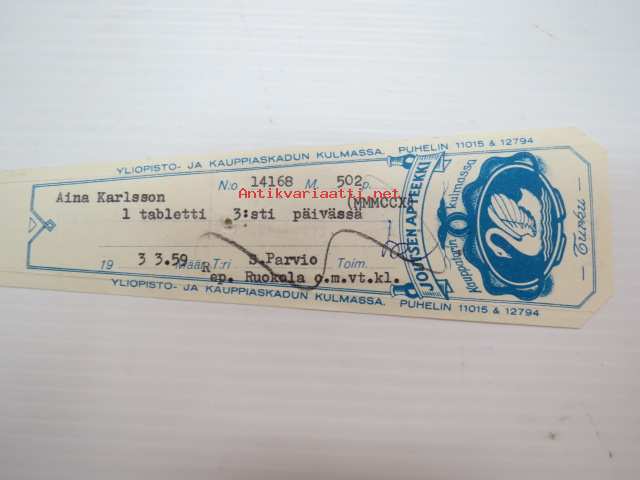 Joutsen Apteekki, Turku, 3.3.1959 -apteekkisignatuuri, reseptiliuska