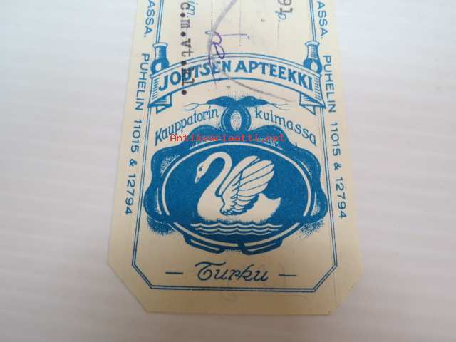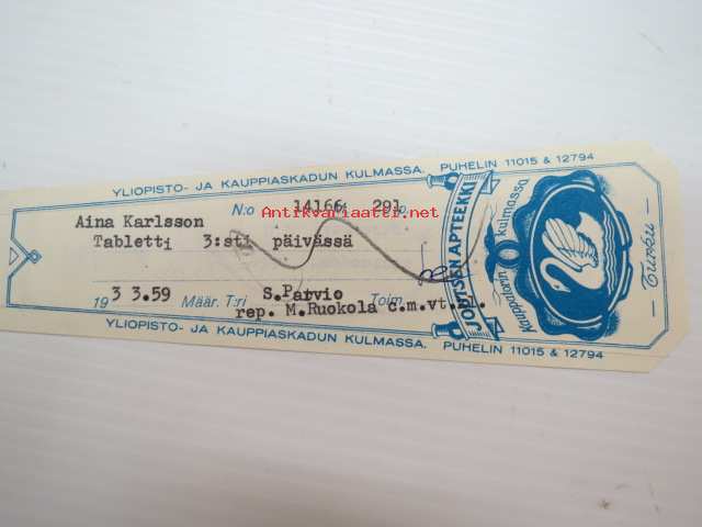 Joutsen Apteekki, Turku, 3.3.1959 -apteekkisignatuuri, reseptiliuska
