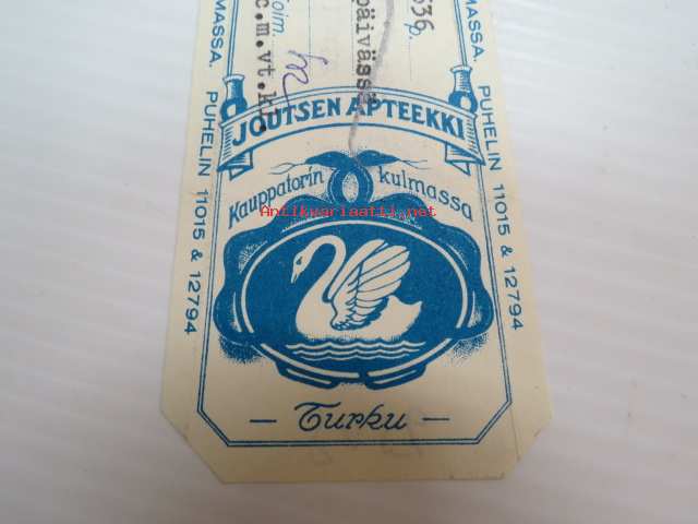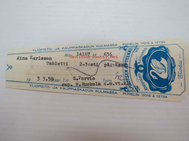 Joutsen Apteekki, Turku, 3.3.1959 -apteekkisignatuuri, reseptiliuska