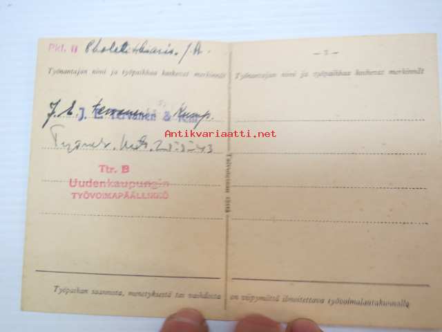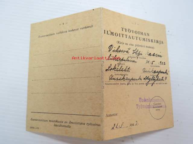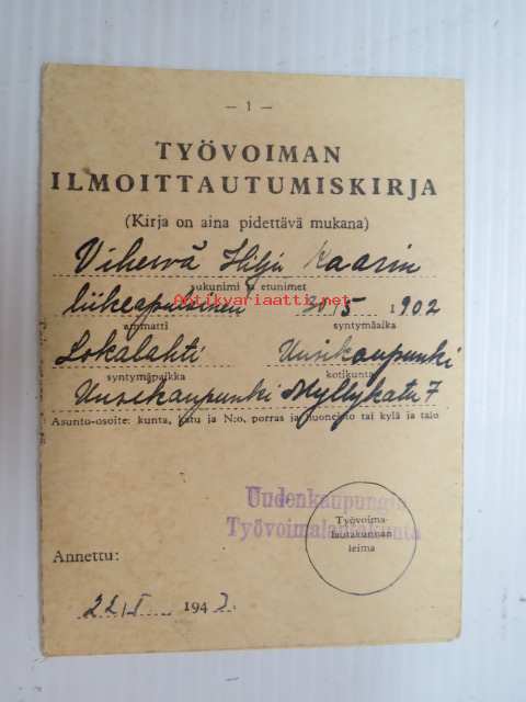 Työvoiman ilmoittautumiskirja Hilja Kaarina Vihervä, liikeapulainen, Uusikaupunki, 22.1.1943