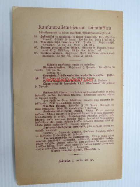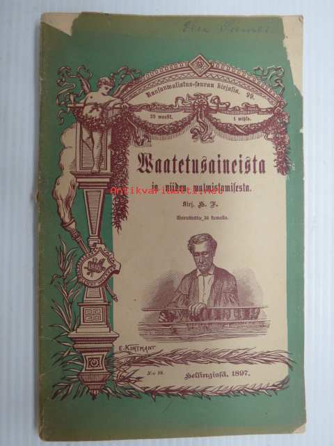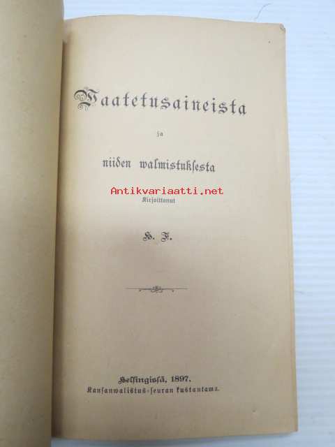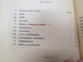 | Saatavilla | 1 kpl | | Julkaisuvuosi | 1897 | | Sivuja | 106 | | Painos | 1. | | Kunto | K2 | | Kulunut | | Sidonta/painoasu | Nidottu (pehmeäk.) | | Kielet | Suomi |