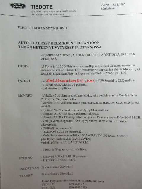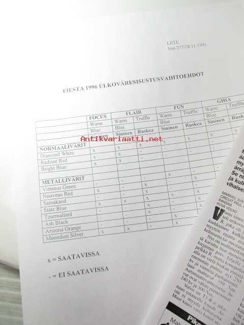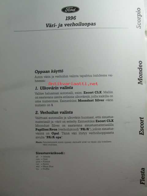 Ford Fiesta, Escort, Monseo, Scorpio, Escort Van, Transit, Tourneo Väri- ja verhoilumallit 1996,5
