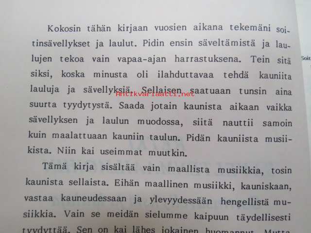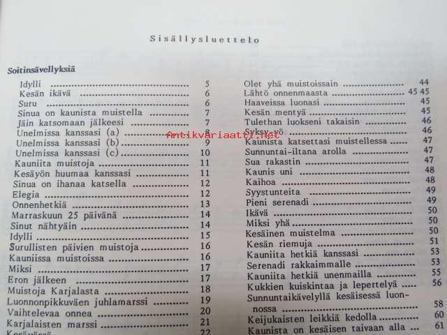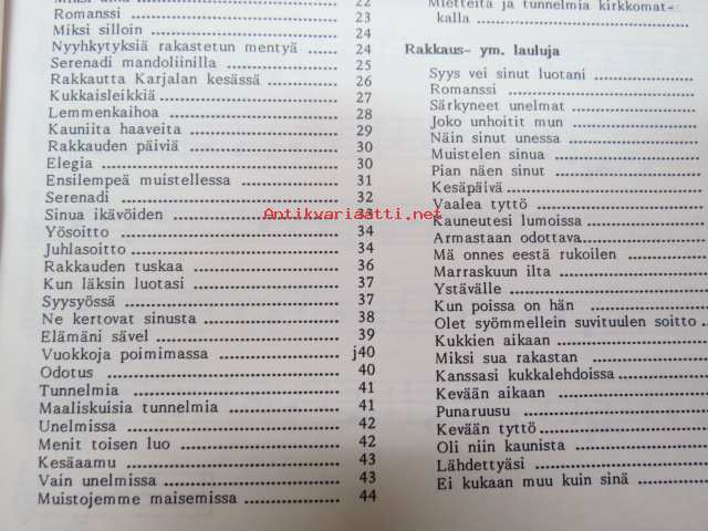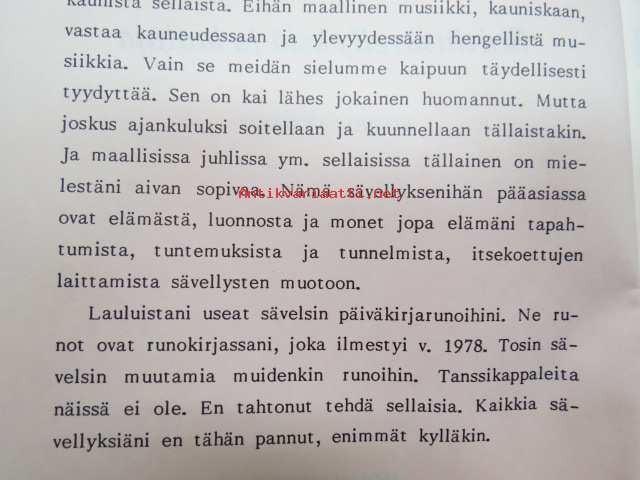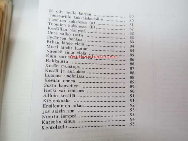 | Saatavilla | 10 kpl | | Julkaisuvuosi | 1989 | | Sivuja | 95 | | Painos | 1. | | Kunto | K2 | | Sidonta/painoasu | Nidottu (pehmeäk.) | | ISBN | 951-9360-69-7 | | Kielet | Suomi |