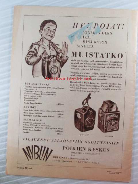| Saatavilla | 1 kpl | | Julkaisuvuosi | 1956 | | Kunto | K2 | | Sidonta/painoasu | Lehti | | Kielet | Suomi |