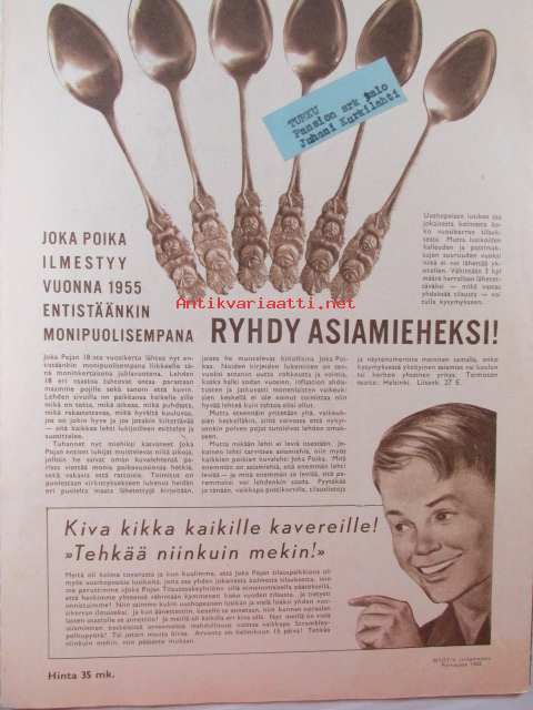 | Saatavilla | 1 kpl | | Julkaisuvuosi | 1955 | | Sivuja | 19 | | Kunto | K2 | | Sidonta/painoasu | Lehti | | Kielet | Suomi |