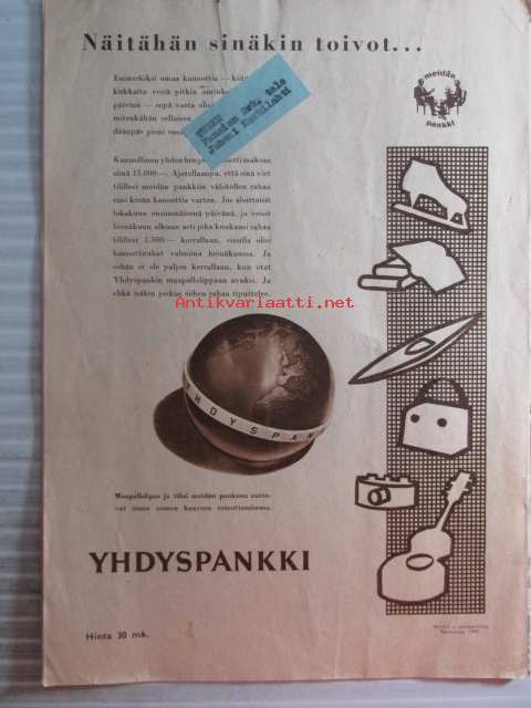 | Saatavilla | 1 kpl | | Julkaisuvuosi | 1955 | | Kunto | K2 | | Sidonta/painoasu | Lehti | | Kielet | Suomi |