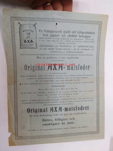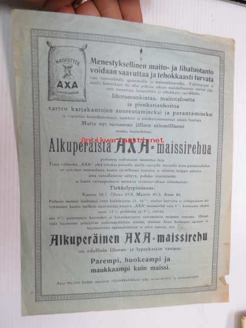 Alkuperäistä AXA-maissirehua... valiorehua, porsaille, sioille, raavaille, hevosille kuin pienkarjallekin... parhainta rauhanajan laatua / AXA-maisfoder av fredstidens kvalitet.. -myyntiesite