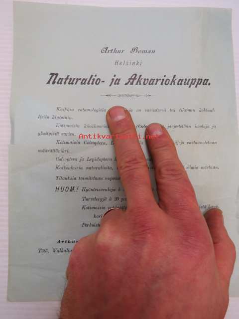 Arthur Boman Helsinki - Naturalio- ja Akvariokauppa -mainosesite "Kaikkia entomologisia tarvekaluja on varastossa... - Kotimaisia kovakuoriaiskokoelmia (Coleoptera) järjestetään.... vastaanotateaan määrättäväksi... lajeja vaihdetaan... Kaikenlaisia naturalioita, etenkin herbarioita ja munakokoelmia ostetaan...