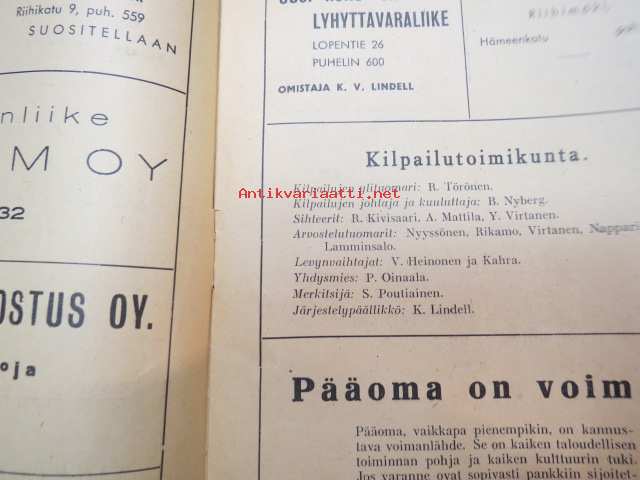 | Saatavilla | 1 kpl | | Julkaisuvuosi | 1946 | | Sivuja | 16 | | Kunto | K2 | | Sidonta/painoasu | Nidottu (pehmeäk.) | | Kielet | Suomi |