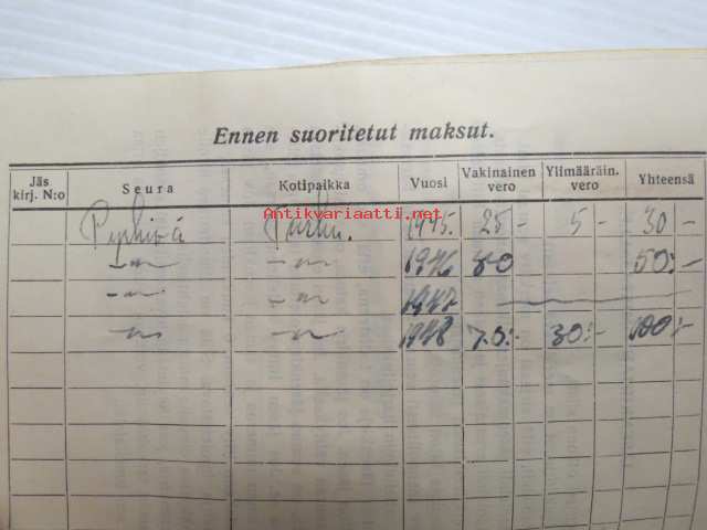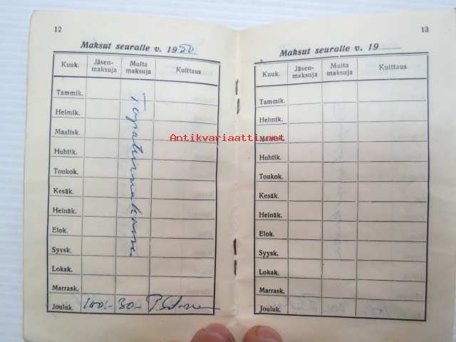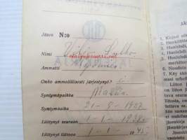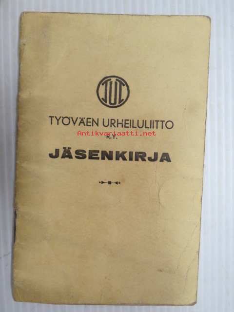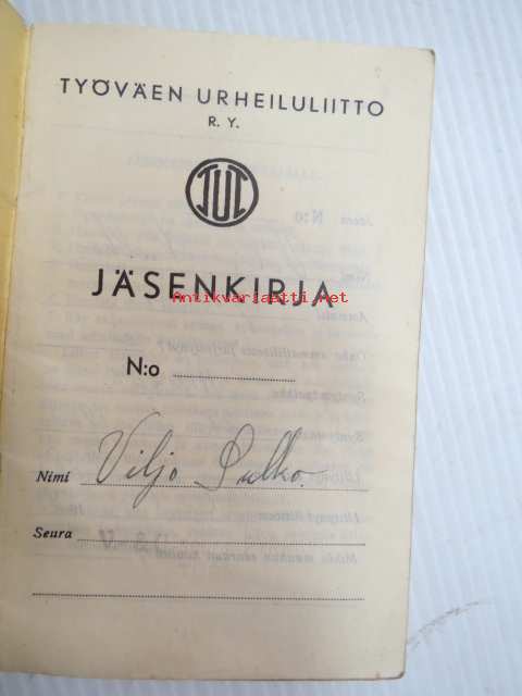 Työväen Urheiluliitto ry jäsenkirja Viljo Sulko, V & U seura Pyrkivä, Turku