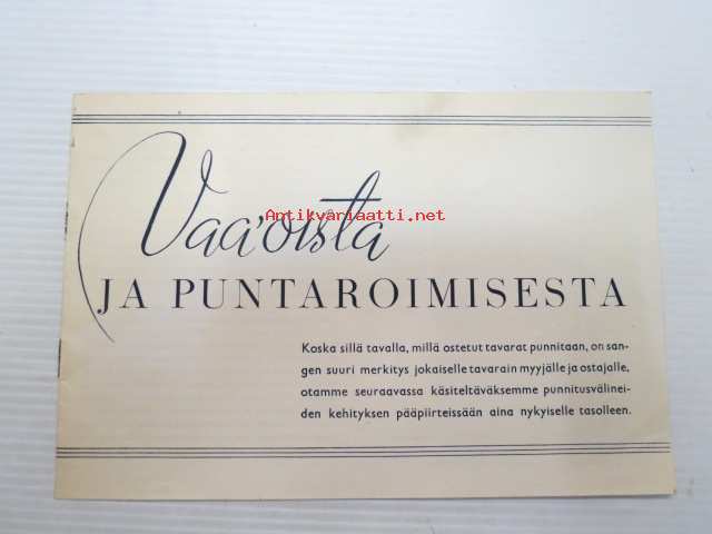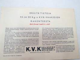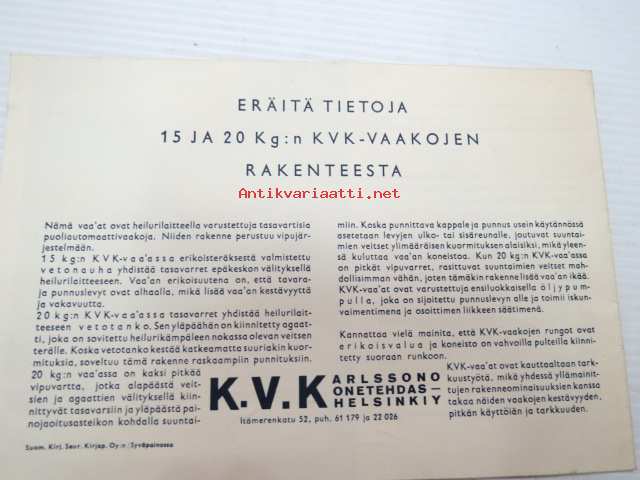 Vaaoista ja puntaroimisesta - K.V. Karlsson Konetehdas Oy Helsinki - Eräitä tietoja 15 ja 20 kg:n KVK-vaakojen rakenteesta, myyntiesite