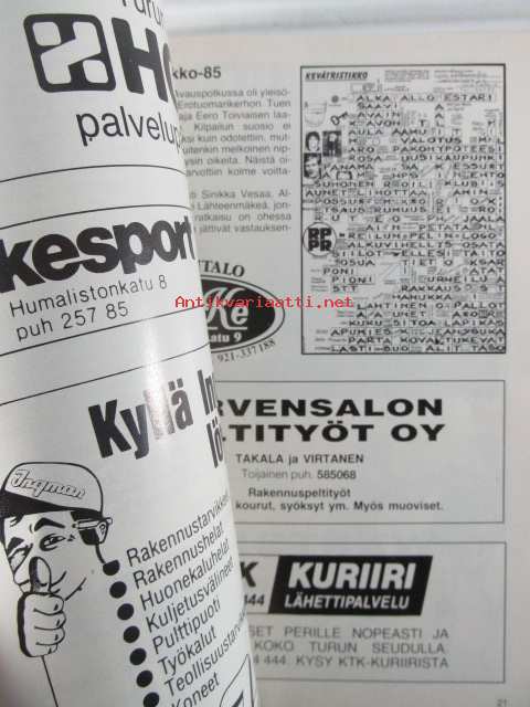 | Saatavilla | 1 kpl | | Julkaisuvuosi | 1986 | | Sivuja | 49 | | Kunto | K2 | | Sidonta/painoasu | Nidottu (pehmeäk.) | | Kielet | Suomi |