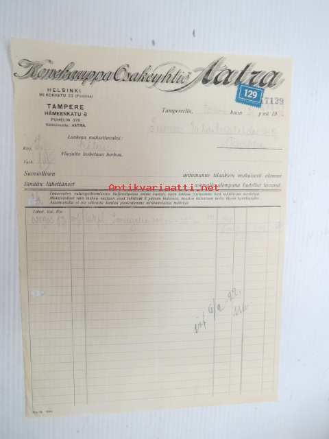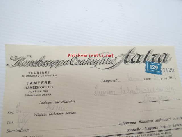 Konekauppa Osakeyhtiö Aatra, Helsinki & Tampere, 31.1.1922 -asiakirja