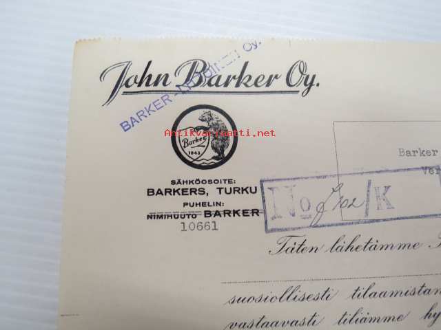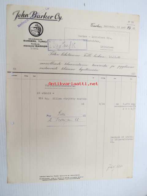 John Barker Oy, Turku, 24.11.1942 -asiakirja