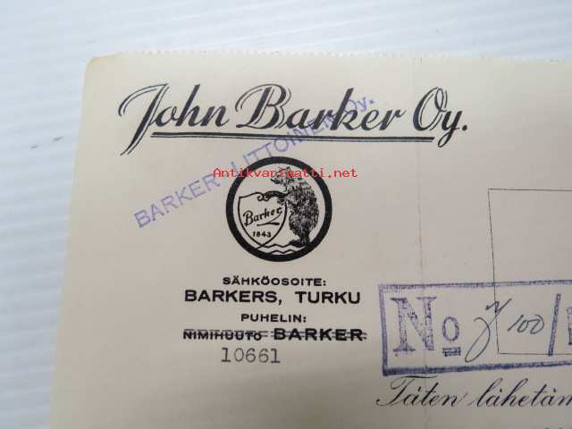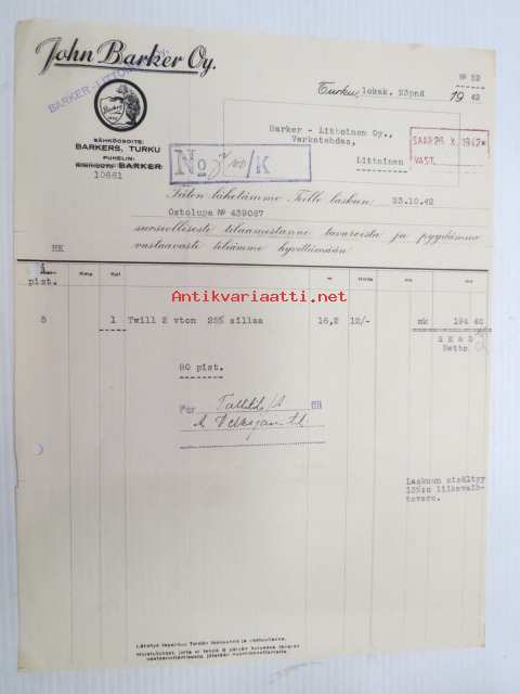 John Barker Oy, Turku, 23.10.1942 -asiakirja