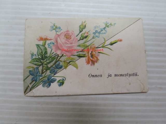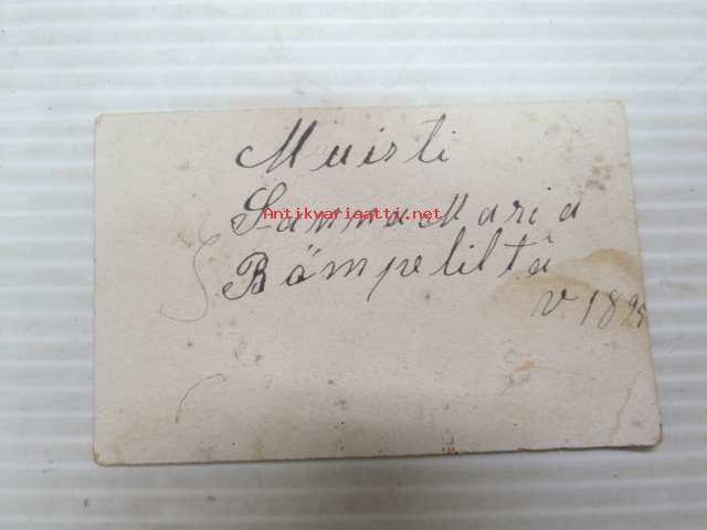 Onnea ja menestystä - "Muisti Sanna Maria Römpeliltä v. 1895" -mitä ilmeisimmin rippikoulun muistoksi annettu kuvakortti, kirjoitustaito ollut heikohko