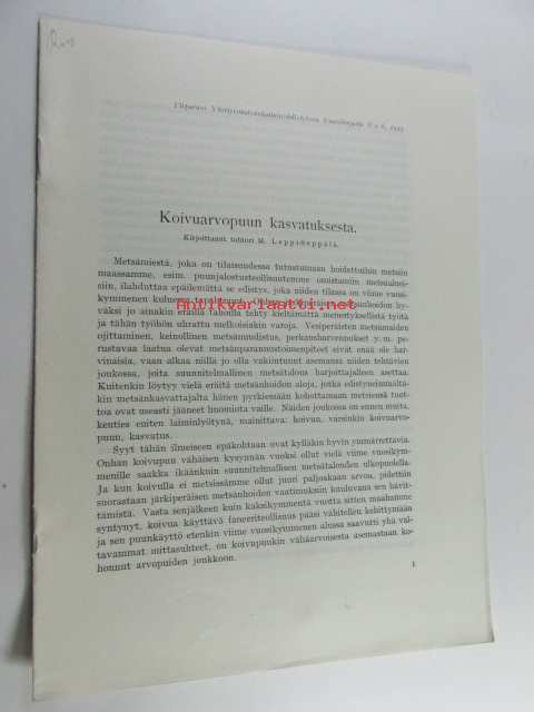 Koivuaarvopuun kasvatuksesta ylipainos Yksityismetsänhoitajayhdistyksen vuosikirjasta 1933 nr 6