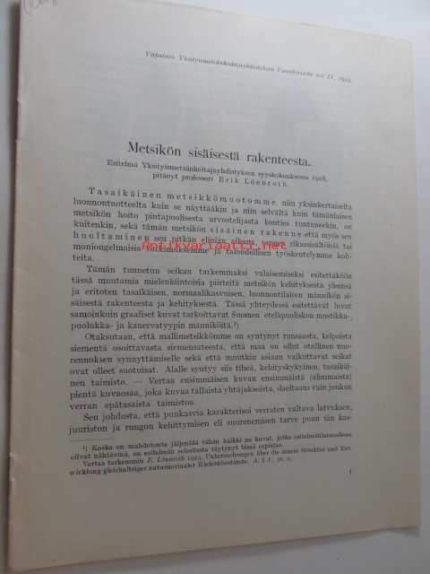 Metsikön sisäisestä rakenteesta esitelmä Yksityismetsänhoitajayhdistyksen syyskokouksessa 1928 pitänyt professori Erik Lönnroth - ylipainos