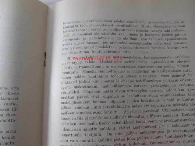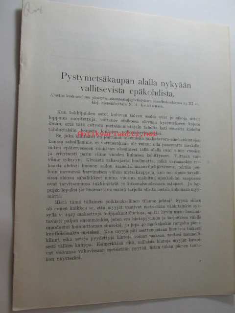 Pystymetsäkaupan alalla nykyään vallitsevista epäkohdista alustus keskusteluun Yksityismetsänhoitajayhdistyksen vuosikokouksessa 25.3.1929 kirjoittanut metsänhoitaja N.A. Lehtonen