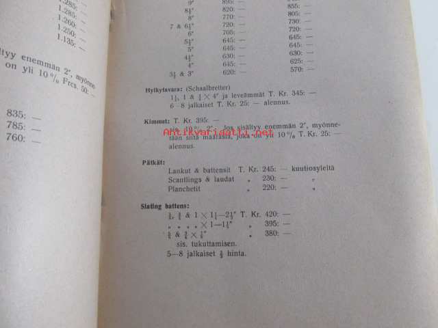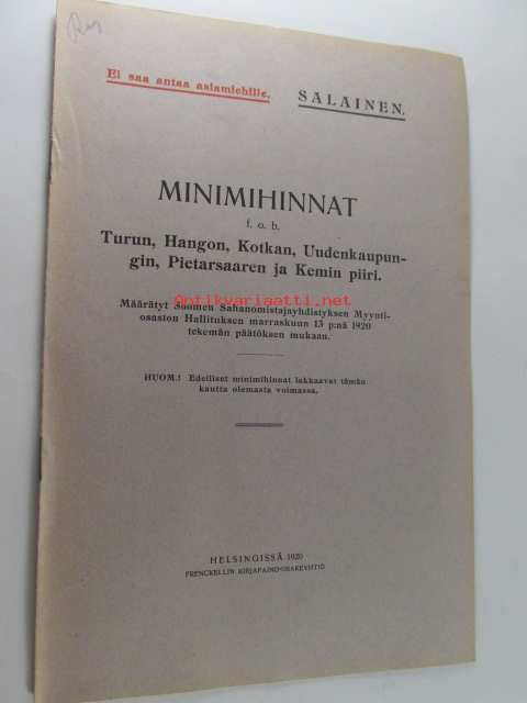Minimihinnat Turun, Hangon, Kotkan, Uudenkaupungin, Pietarsaaren, Kemin piiri - määrätyt Suomen Sahanomistajayhdistyksen Myyntiosaston hallituksen marraskuun 13 p:nä 1920 tekemän päätöksen mukaan - salainen