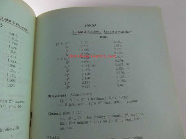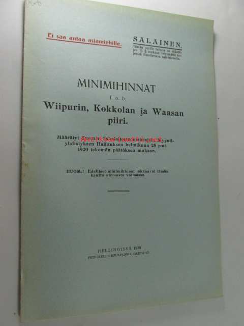Minimihinnat Wiipurin, Kokkolan ja Waasan piiri - määrätyt Suomen Sahanomistajayhdistyksen Myyntiosaston hallituksen helmikuun 28 p:nä 1920 tekemän päätöksen mukaan - salainen