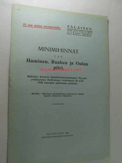 Minimihinnat Haminan, Raahen ja oulun piiri - määrätyt Suomen Sahanomistajayhdistyksen Myyntiosaston hallituksen helmikuun 28 p:nä 1920 tekemän päätöksen mukaan - salainen