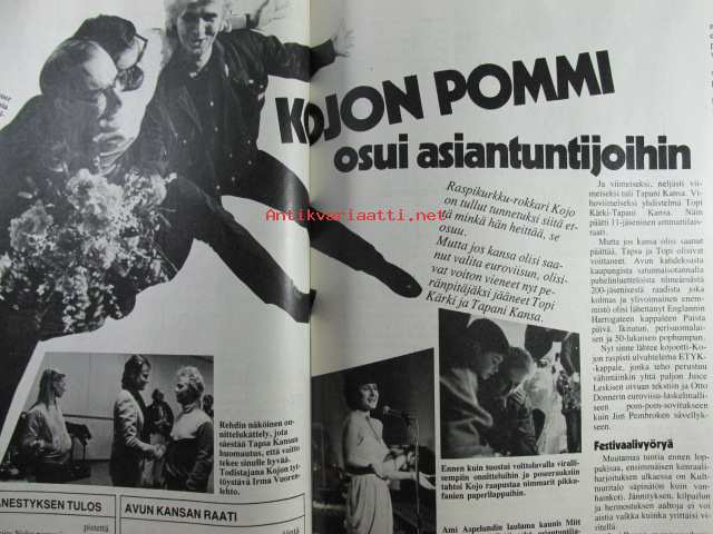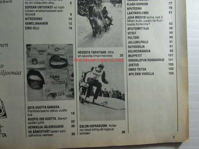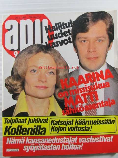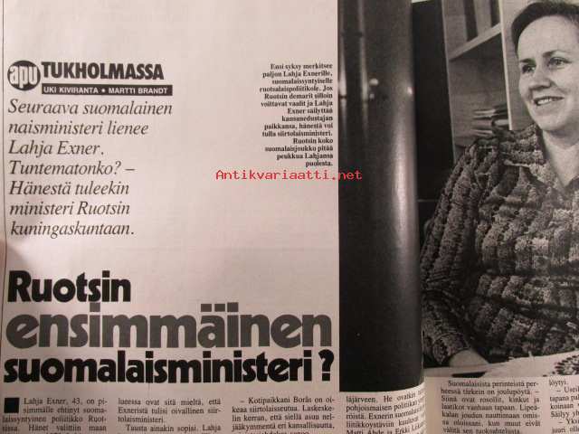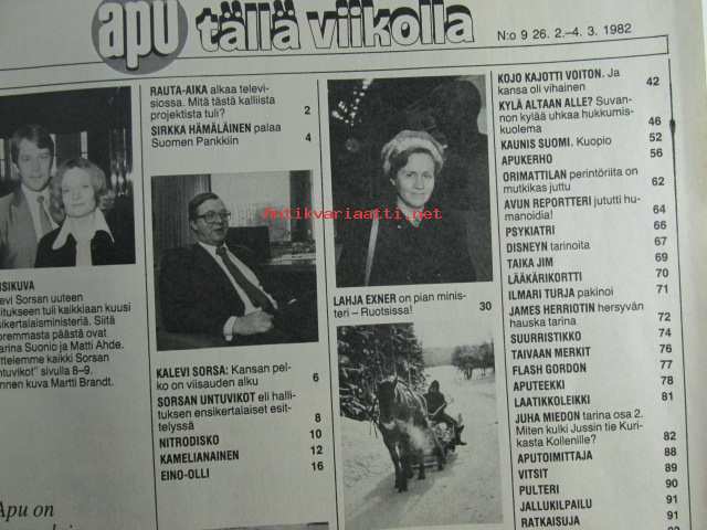 Apu 1982 nr 9, sis. mm. seur. artikkelit / kuvat / mainokset; juha mieto vanhoille ja väkevä elämä, lapin kaunein kylä tuhon edessä Pelkosenniemen Suvannon kylästä kitisenjoen varresta, Toipilaitten hopeajuhlat Holmenkollenilla Riihivuori hilkka ja Jari Puikkonen, Lahja Exner Ruotsin 1. suomalaisministeri, ihanat jälkiruuat - vadelma unelma karamellivanukas - appelsiini tytinä - vitamiinivarvit, Helsingin Pantti Oy:n toimitusjohtaja Holger Nyholm - 100 vuotta kanissa, Pääministeri Kalevi Sorsan hallituksen untuvikot, Sirkka Hämäläinen pidän ihmisistä ja työnteosta, Rauta-aika laulu rakkaudesta, katso sisältö kuvista tarkemmin.