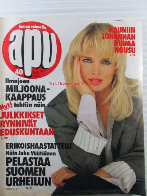 Apu 1986 nr 40, sis. mm. seur. artikkelit / kuvat / mainokset; 20 autouutuutta - kuvat-tekniikka ja hinnat, Seppo Hautalan ylösnousemus VS-konkurssien raunioista, Metsureiden MM-kisat Tšekkoslovakiassa, Nelijalkaiset supertähdet Vermossa, Pentti Salmen raportti yksinpurjehdukselta - terveisiä päiväntasaajalta, Vaaralliset yhdessä elokuvan vanhan kunnon hurmuri Robert Redford, Bogart & Co vauhdissa, Juha Väätäinen juoksijoiden päävalmentaja, Hollywoodin Kultasormi Steven Spielberg, katso sisältö kuvista tarkemmin