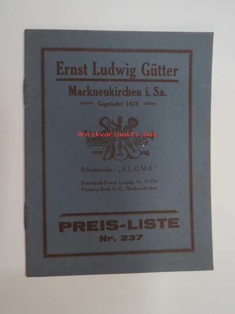 Ernst Ludvig Gütter "ELGMA" Preis-Liste nr 237 -soittimenrakennuksen työkaluja, soittimia, tarvikkeita -tuoteluettelo